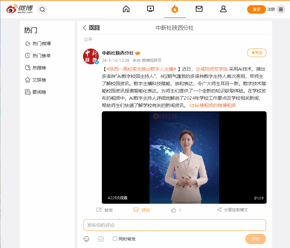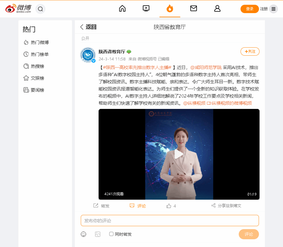 陕西教育厅报道我校采用AI技术,推出多语种“AI数字校园主持人”。