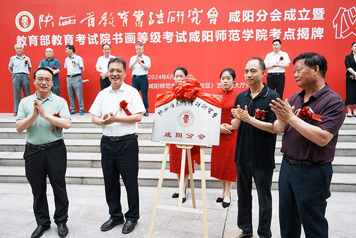 陈俊哲、邢步宜、王长顺、曹书生为“陕西省教育书法研究会咸阳分会”揭牌。