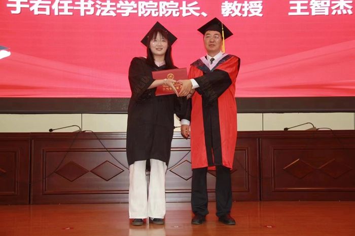 于右任书法学院院长王智杰教授为2024届毕业生颁授学位,扶正流苏并合影留念。他借用王国维人间词话的基本逻辑,向同学们解读了重要书学理论“书者如也”的内涵,提出了走向社会进一步研习书法文化的三重境界:第一层面,习百家碑帖,练过人技能,为万众服务。第二层面,读万卷良书,锻高洁品德,修不败之身。第三层面,立鸿鹄之志,走书法正道,弘文化伟业。并祝愿大家在中华优秀传统文化复兴的大背景下,坚定文化自信,找准目标定位,展开奋斗翅膀,大鹏冲天九万里,实现自己的人生理想。