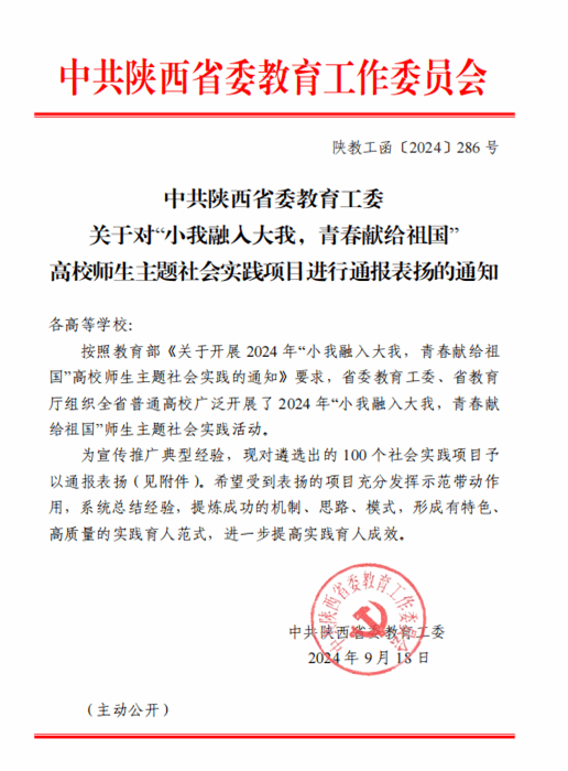近日,在陕西省委教育工委、省教育厅面向全省普通高校组织开展的2024年“小我融入大我,青春献给祖国”高校师生主题社会实践活动遴选中,我校“上好‘行走的思政课’,让青春为中国式现代化挺膺担当”“‘彩绘老街,共筑新梦’墙绘助力老街文化改造”“手绘清风,至善至美——非遗文化志愿服务”等3个社会实践项目受到通报表扬。