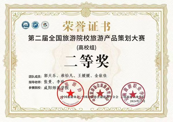 近日,第二届全国旅游院校旅游产品策划大赛全国总决赛在云南圆满收官。我校“乐怀明途研学旅行创想队”荣获全国二等奖,同时荣获“优秀组织院校”称号。该队是此次大赛陕西高校中唯一获奖队伍,团队由经济与管理学院张曼、李玲两位老师指导,成员包括郭天乐、淮怡凡、王媛媛、金依佳四位同学。