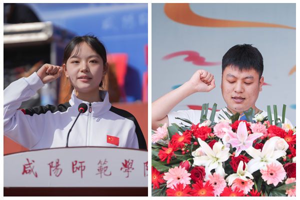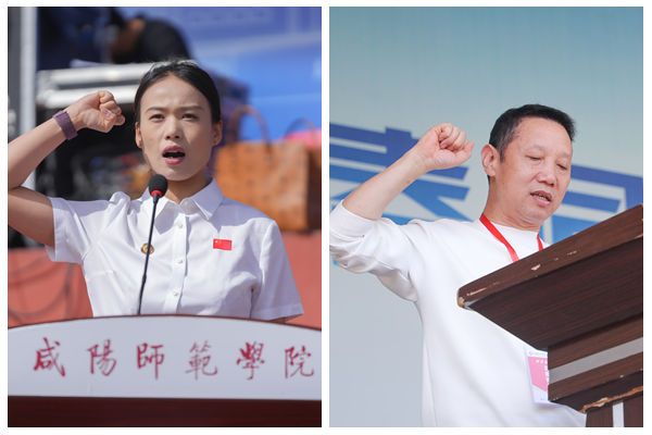 体育学院教师许怡欣、秦都书院教师田耕代表裁判员宣誓,文学与传播学院学生姜正慧、秦都书院学生焦浩代表运动员宣誓。