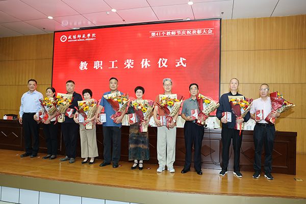 大会举行了新教师入职暨教职工荣休仪式。王长顺为退休教职工代表献上鲜花,送上温暖祝福,与退休教师代表为新入职教师佩戴校徽、赠送书籍。