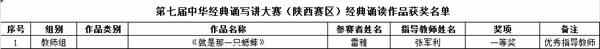 近日,由陕西省教育厅、省语委共同主办的第七届中华经典诵写讲大赛陕西赛区获奖名单公布。经过激烈角逐,我校师生荣获一等奖21项、二等奖24项、三等奖28项、优秀奖20项、优秀指导奖10项。
