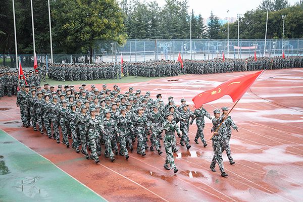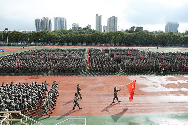 在军事技能训练成果展环节中,分列式方队由47个方队组成,4000余名同学迈着整齐铿锵的步伐,伴随着响亮的口号英姿飒爽地依次通过主席台接受检阅。匕首方队同学手持匕首突出实战性的精彩呈现,深刻彰显学子不畏艰难、刚毅坚定的精神品格。