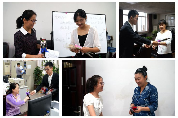 志愿者们手捧鲜花,分头行动,他们走进各部门、教室,向老师送上节日的祝福。他们在在行知广场、图书馆前、学馨苑前为下课经过的老师送上鲜花,致以真挚的祝福,并与老师合影留念。校园的各个角落都弥漫着浓郁的师生情谊。收到鲜花的老师都表示,“学生的活动很有创意、十分贴心,令人特别感动”。