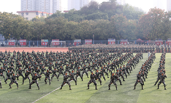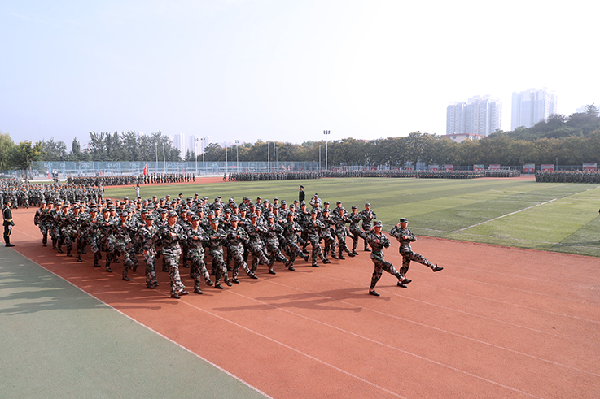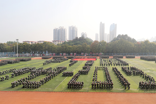 大会在奏唱国歌中拉开序幕。全体新生整装列队,高标准的完成了军体拳、战术、花样队形科目表演。表演过程中,同学们精神饱满、动作规范、队列整齐、气势雄壮,充分展示了军训成果,精彩的表演赢得了全场阵阵掌声。